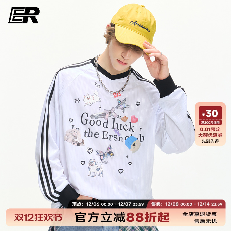 【王玉雯同款】ER撞色条纹卡通印花V领长袖t恤男女oversize上衣