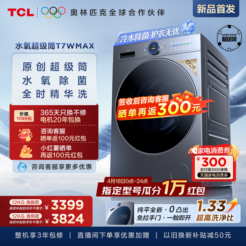 TCL 12KG水氧超级筒洗烘一体机T7WMax滚筒洗衣机大容量全自动家用