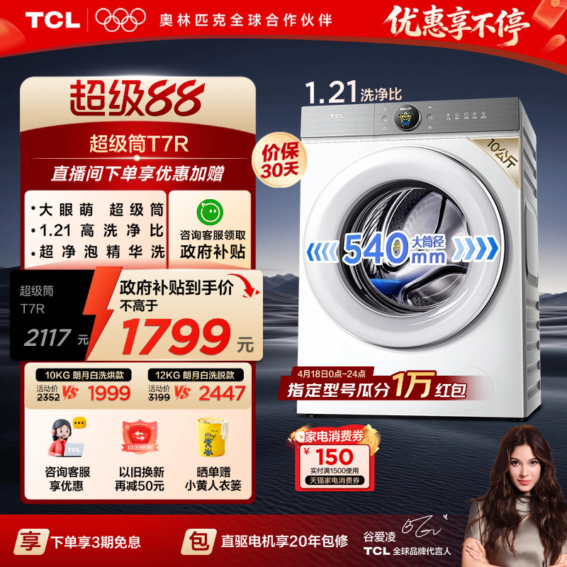 TCL大眼萌超级筒T7R洗烘一体10/12KG滚筒洗衣机全自动家用国补