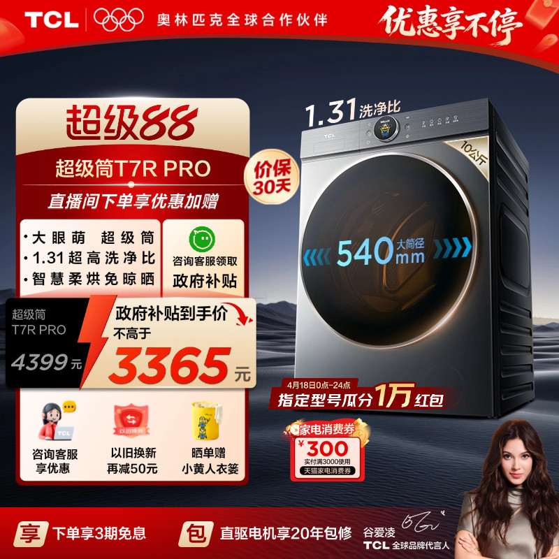 TCL大眼萌超级筒T7R PRO洗烘一体10KG滚筒洗衣机家用全自动国补