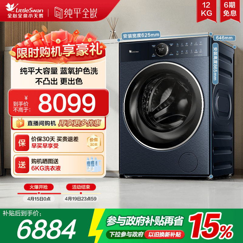 纯平全嵌小天鹅洗衣机本色蓝氧12KG大容量家用全自动滚筒TG12B7