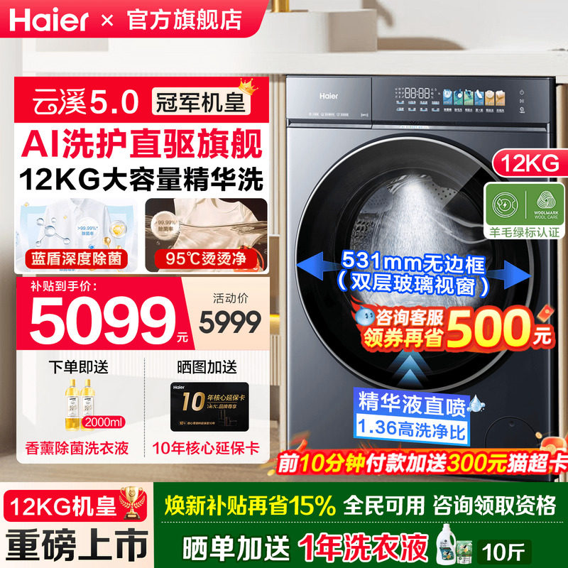 [官仓]海尔云溪5.0冠军机皇12KG滚筒洗衣机全自动大容量洗脱7AD3