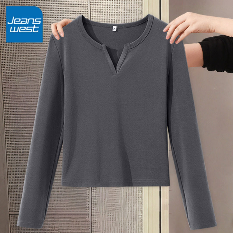 KV真维斯灰色V领长袖内搭女款t恤2026秋季新款修身显瘦打底衫上衣