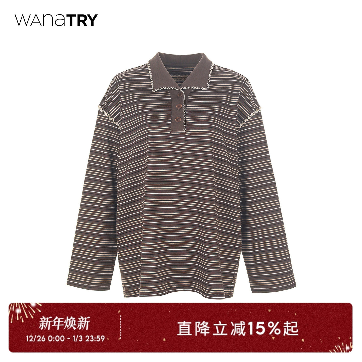 wana try条纹复古钩边polo咖色长袖上衣2025秋季新款宽松女款T恤