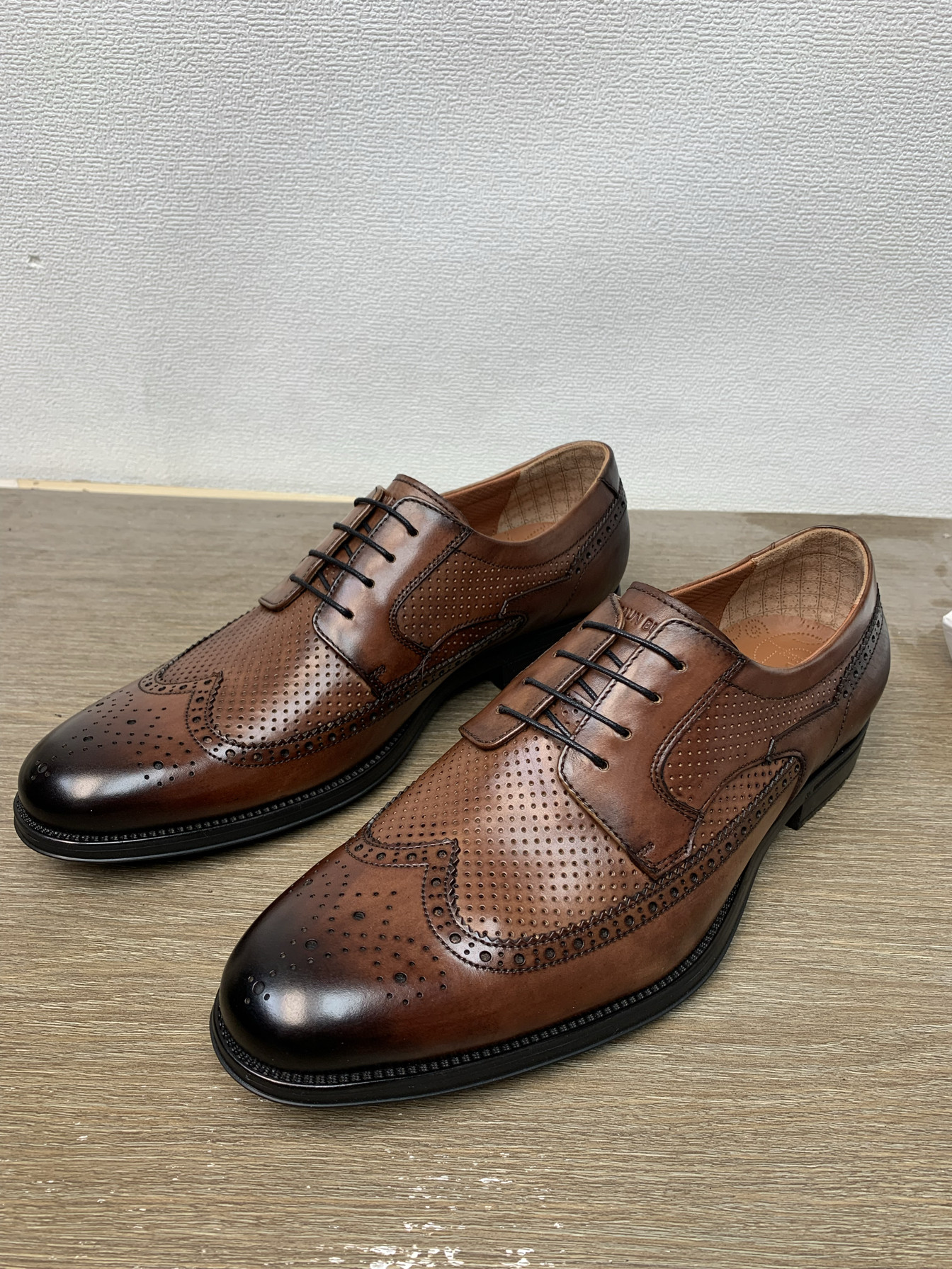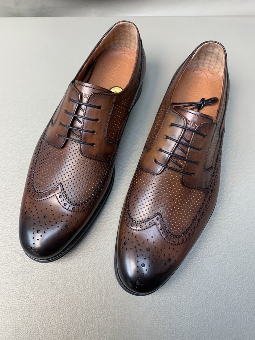 布兰施头层牛皮商务德比鞋 发泡底系带擦色软底男鞋雕花镂空圆头
