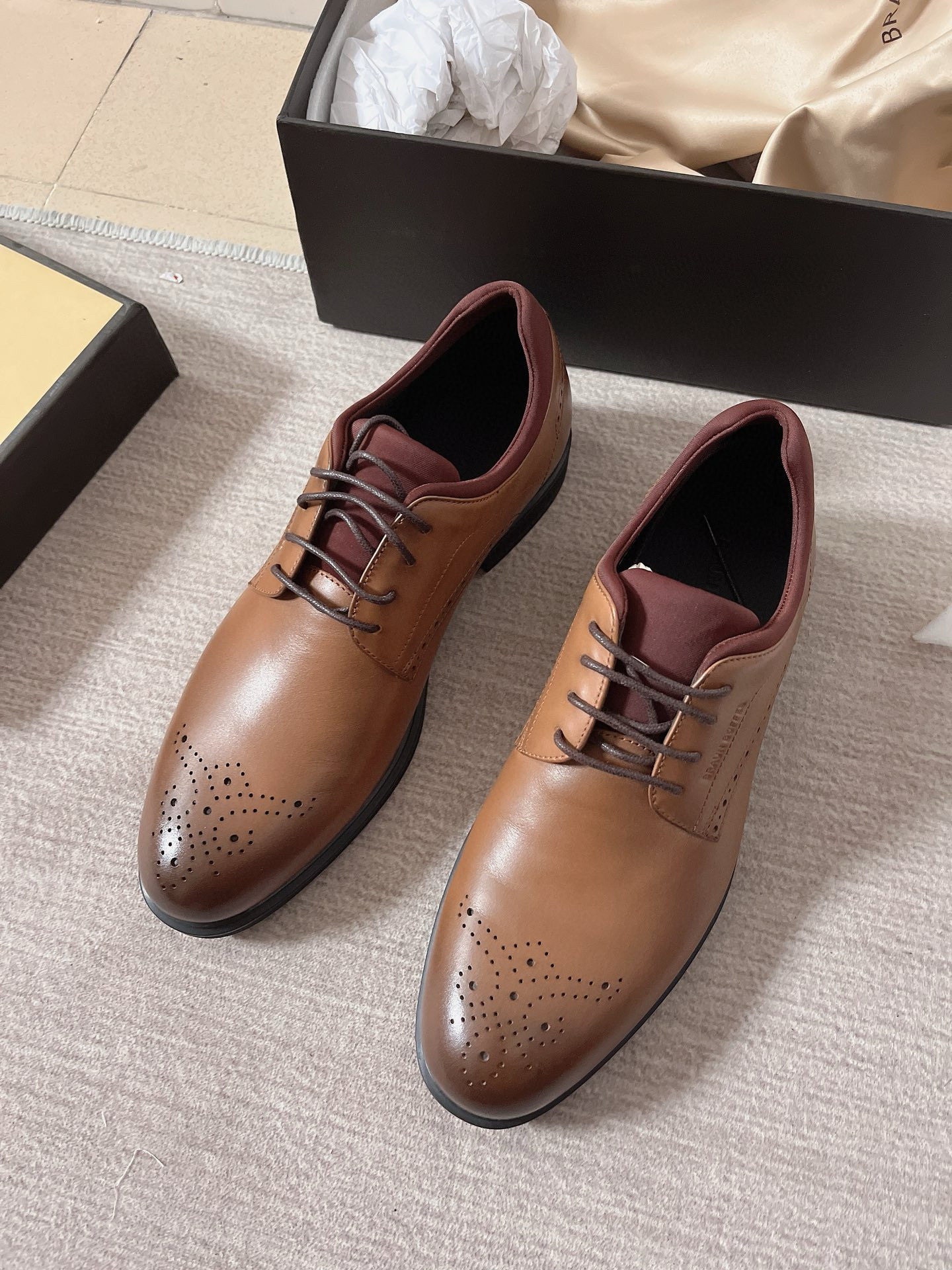 布兰施头层牛皮商务德比鞋 擦色透气发泡底系带软底雕花手工男鞋