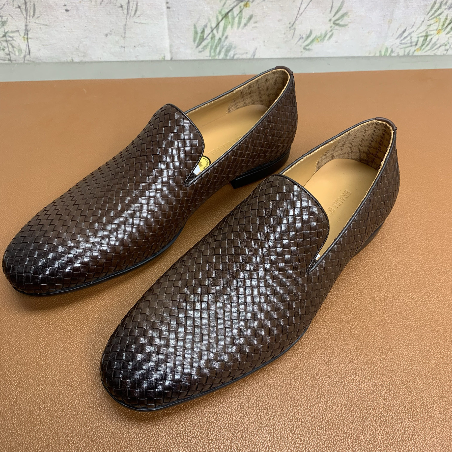 布兰施编织头层牛皮商务休闲皮鞋男缝线板鞋软底气垫透气套脚男鞋