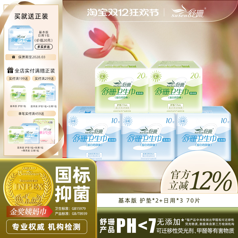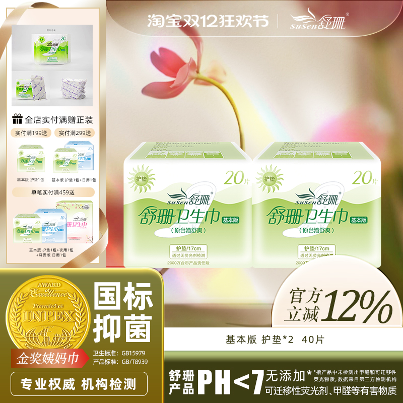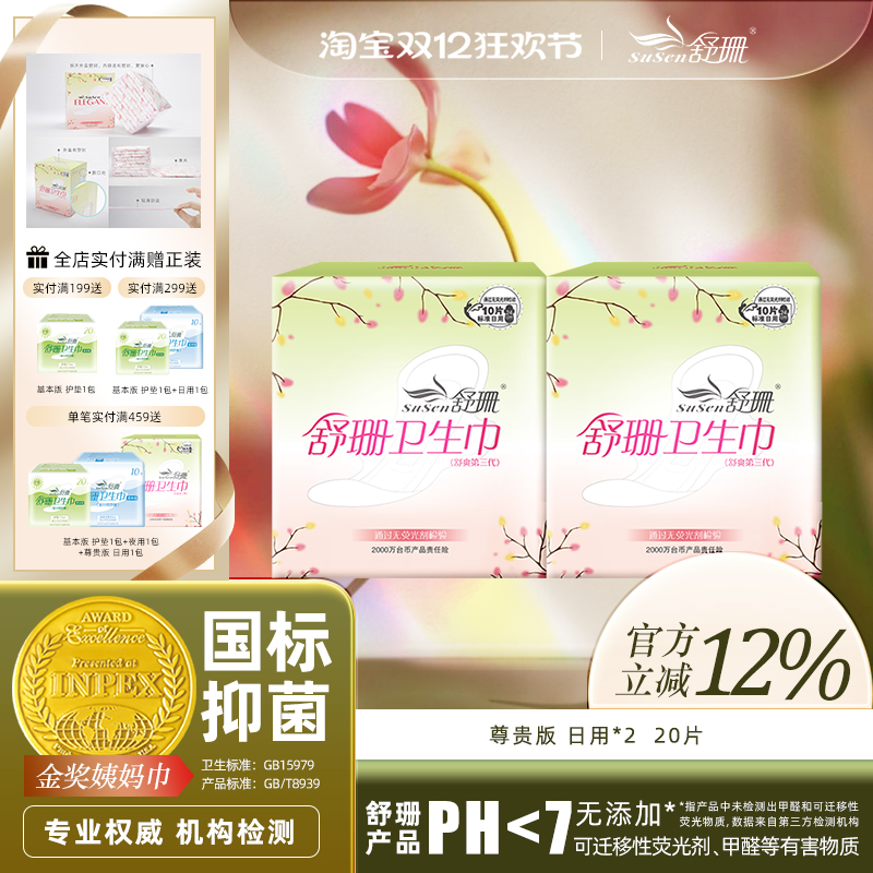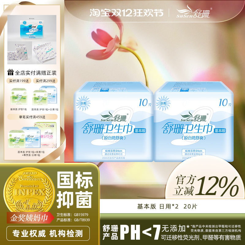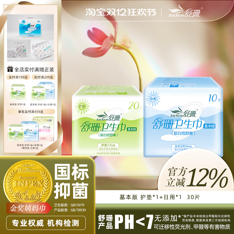 台湾舒珊卫生巾透气棉柔姨妈巾尊贵版日用10片+基本版日用10片