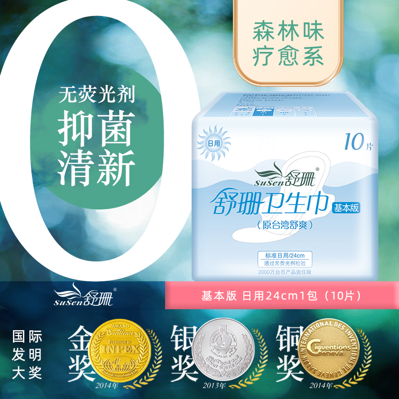 舒珊卫生巾 台湾susen日用苏珊24cm10片暖腹无荧光正品