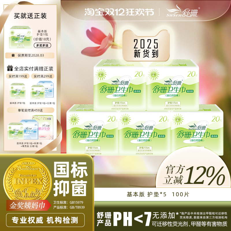 中国台湾舒珊基本版卫生护垫5包无荧光剂柔棉姨妈巾组合 2025新货