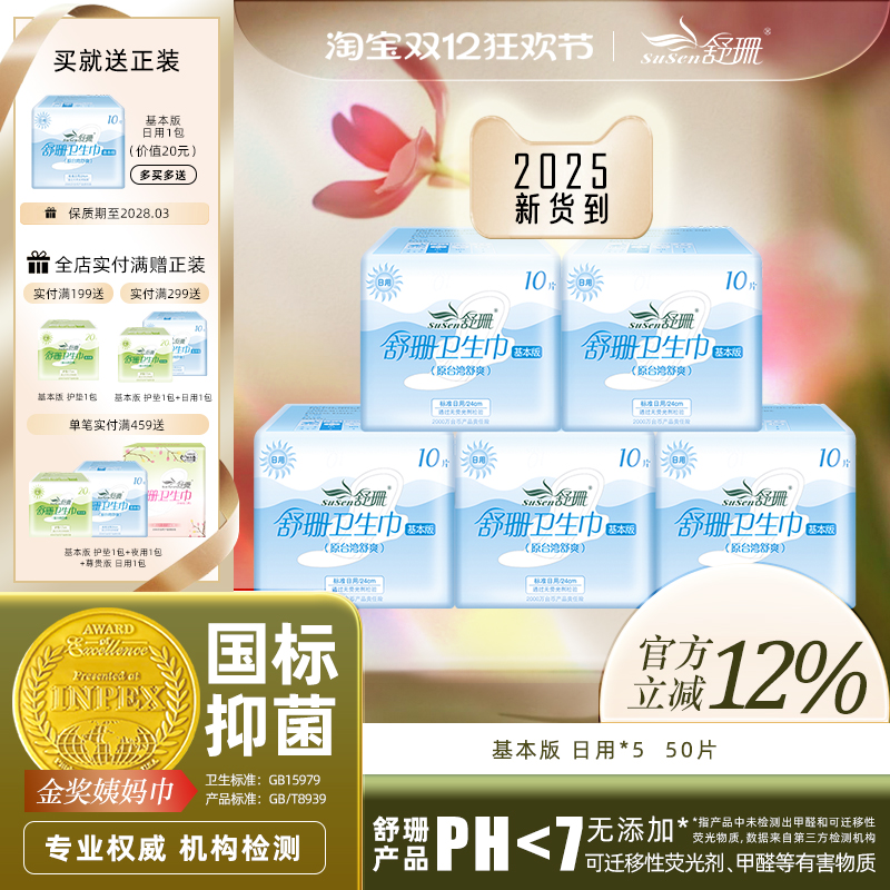 中国台湾舒珊基本版卫生巾日用无荧光剂绵柔透气 24cm*5包/10包