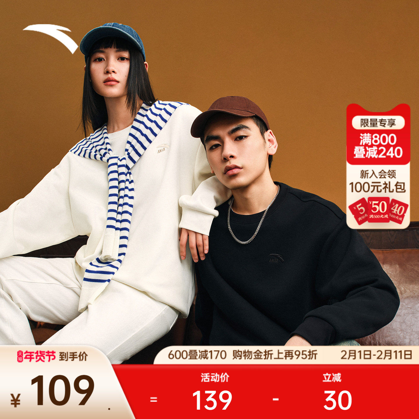 安踏凯里·欧文系列丨美式圆领套头衫卫衣男女休闲上衣172511715