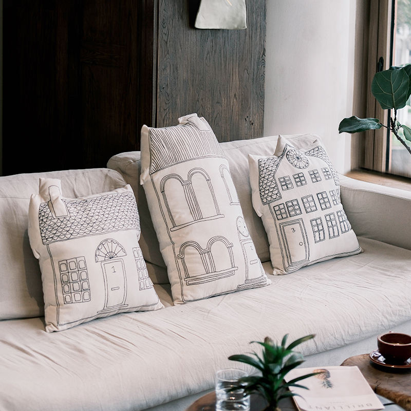 抱枕创意刺绣纯棉小房子靠枕北欧简约客厅网红民宿可拆洗装饰靠垫
