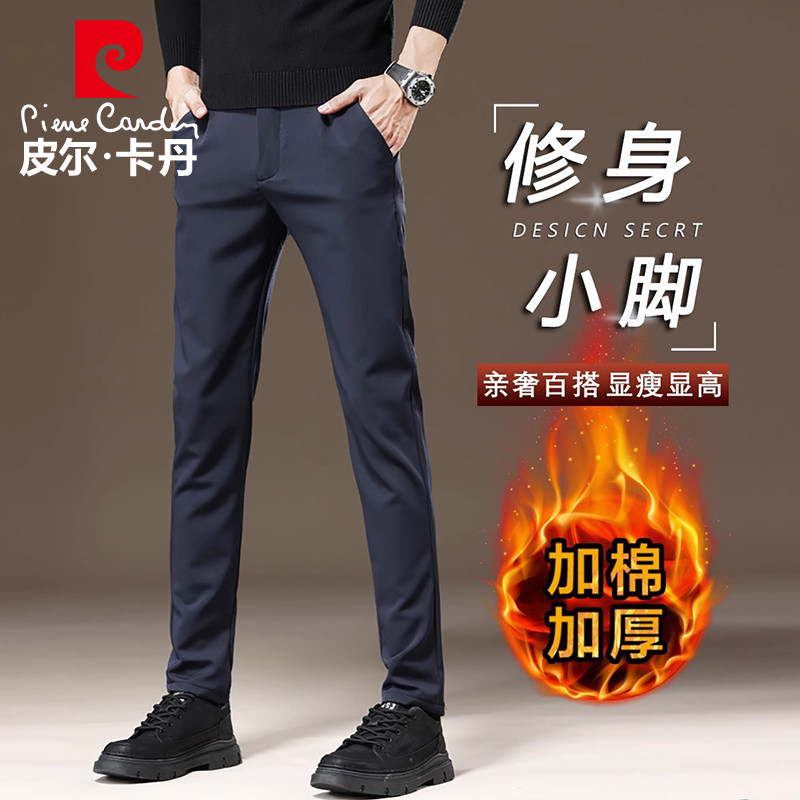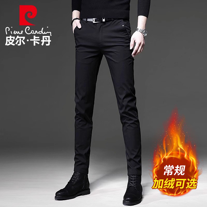 皮尔卡丹男士休闲裤秋冬加绒加厚西裤修身弹力轻商务黑色小脚长裤