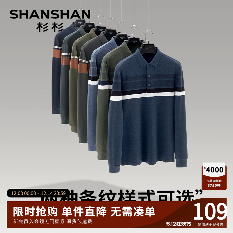 杉杉中年男士长袖T恤翻领2025春秋季新款休闲条纹上衣polo衫男款