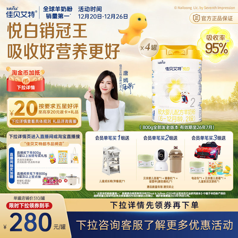 育儿补贴|升级佳贝艾特羊奶粉悦白2段旗舰店800g二段奶粉官方正品