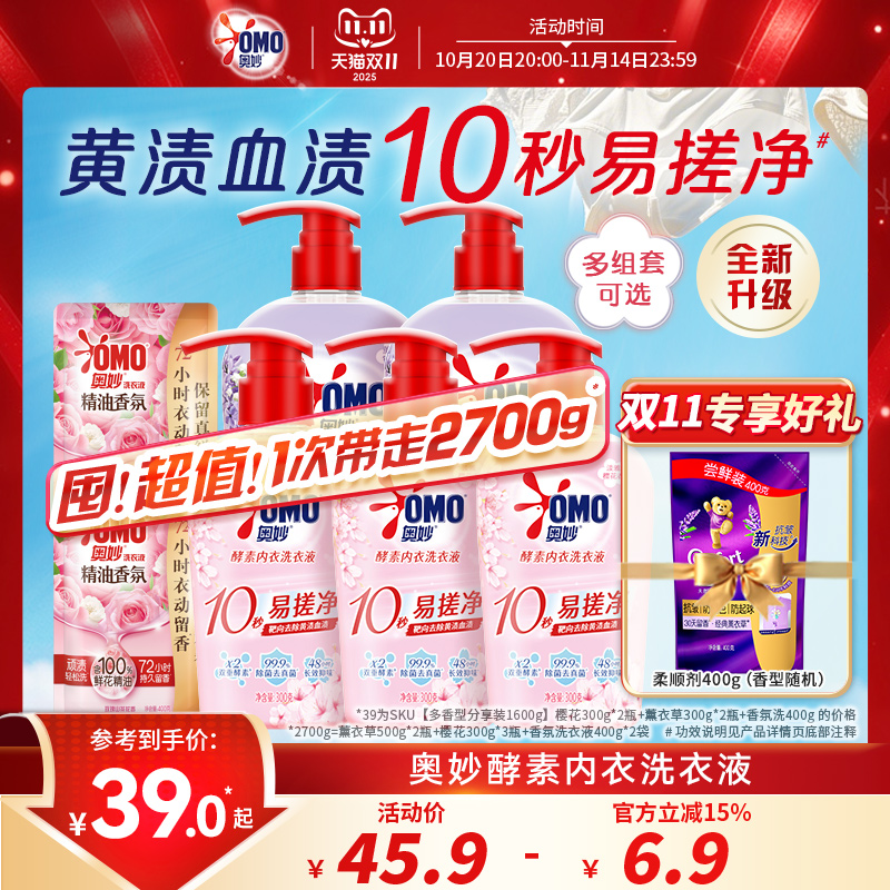 奥妙酵素内衣洗衣液除菌祛渍抑味温和不伤手内衣内裤专用多组套选