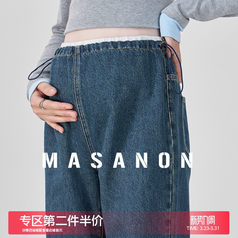 MASANON孕妇背带裤春夏外穿小个子牛仔裤不勒肚子刺绣阔腿裤春装