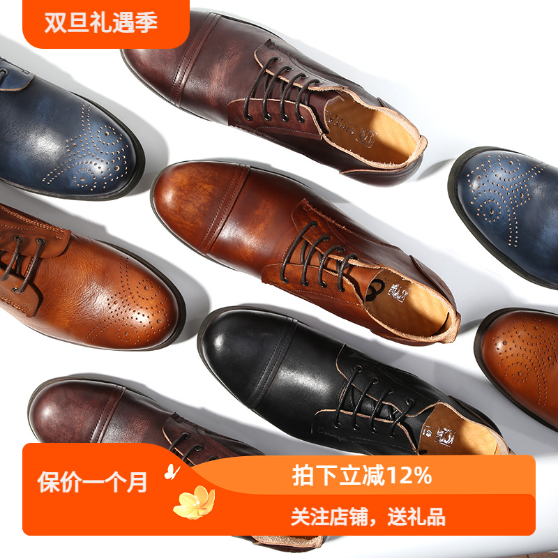 胎牛皮做旧皮鞋男士英伦商务正装德比鞋真皮透气厚底休闲男鞋婚鞋