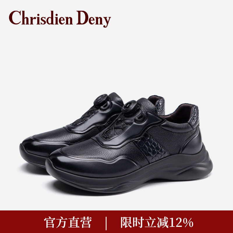 克雷斯丹尼男鞋自动旋扣鹿皮拼鳄鱼皮运动休闲鞋男免系带低帮皮鞋