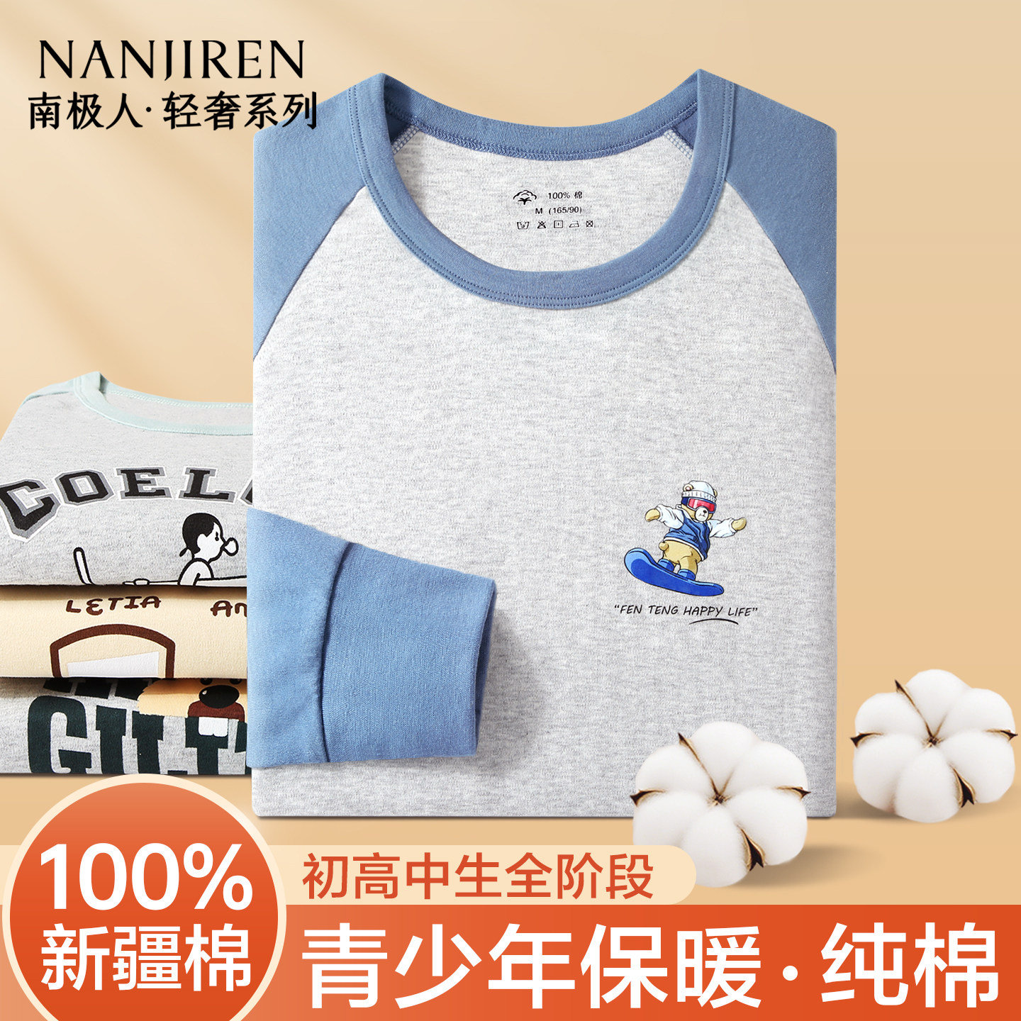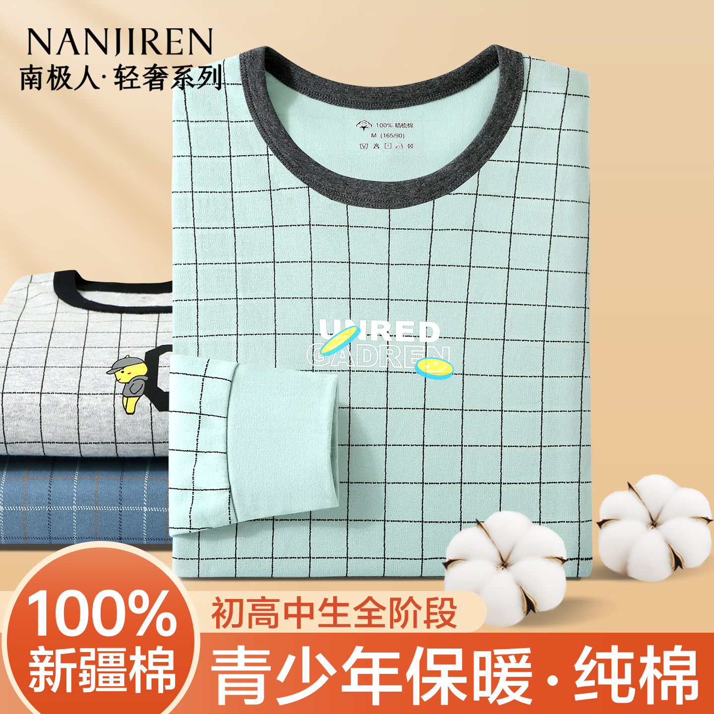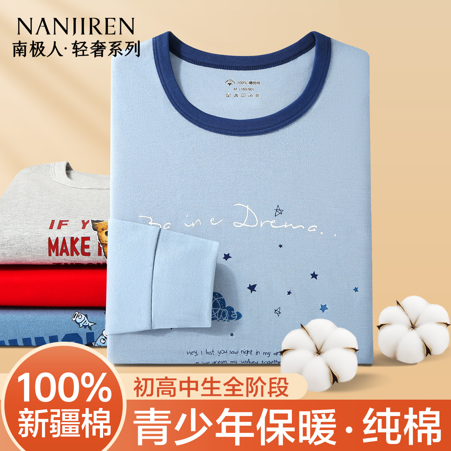 南极人纯棉保暖内衣男秋冬打底衫青少年全棉印花秋衣秋裤男生套装