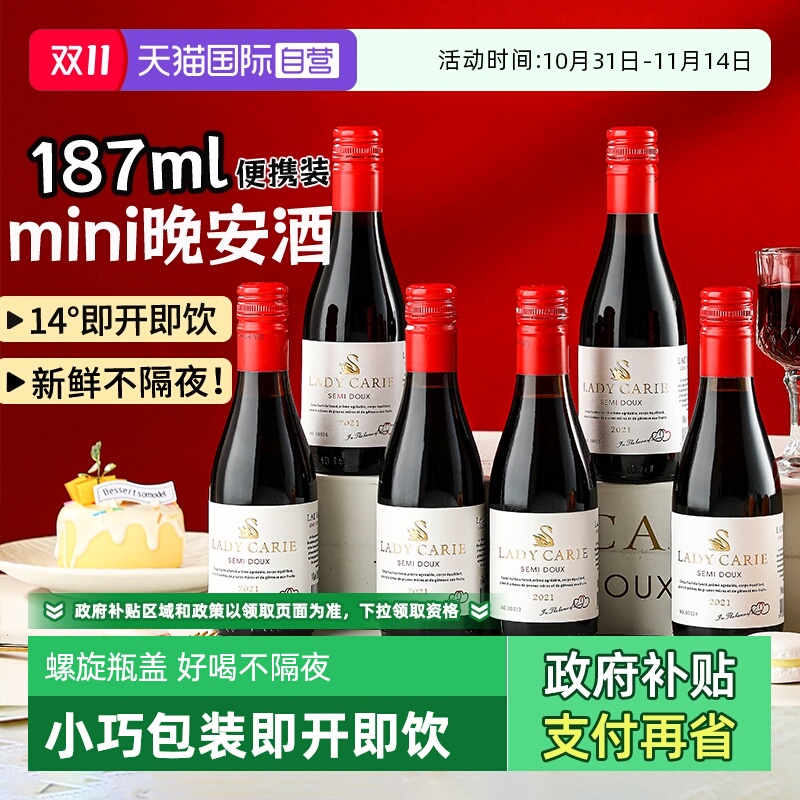 【自营】法国进口小瓶红酒半甜红葡萄酒女士微醺晚安酒整箱礼盒装