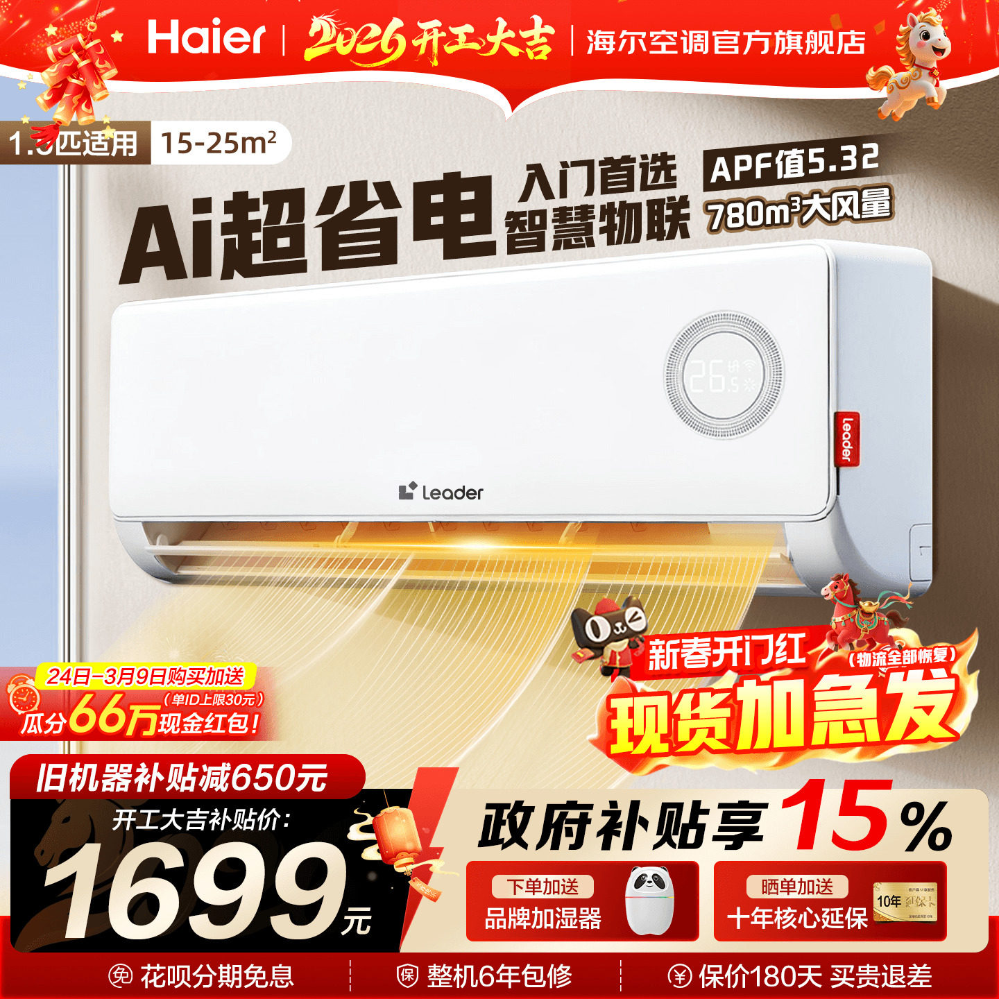 海尔出品统帅超省电空调家用1匹1.5匹2匹一级能效变频卧室挂机补