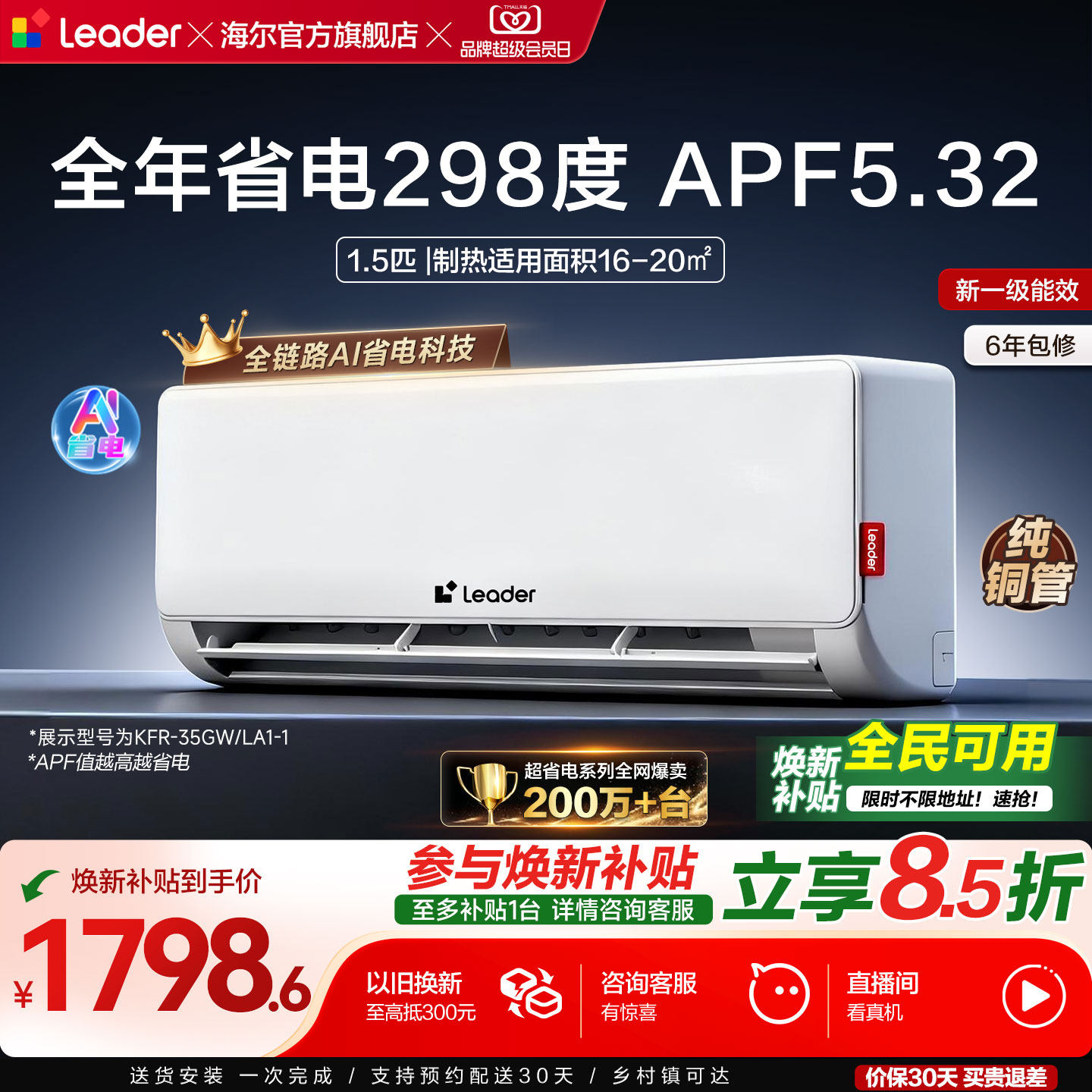 海尔出品统帅超省电冷暖空调1.5匹卧室节能变频挂机一级能效35La1