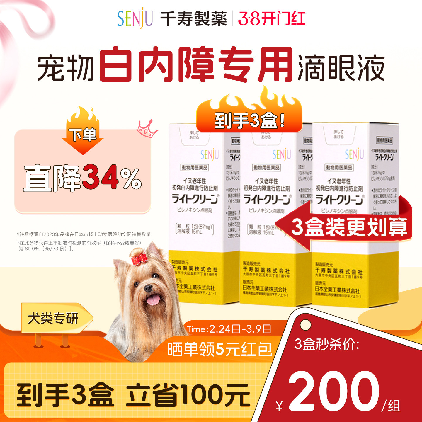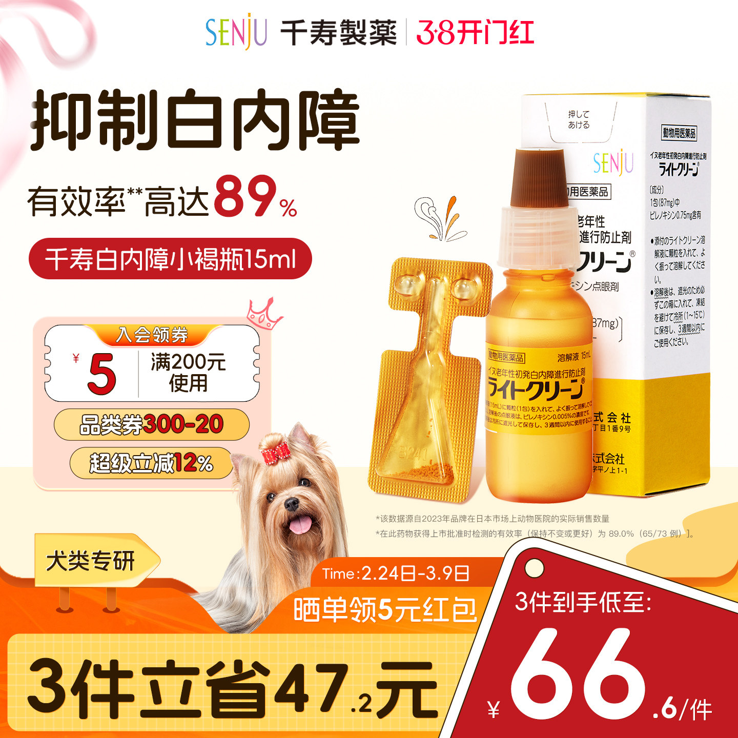 日本千寿滴眼液狗狗白内障专用眼药水中老年犬宠物猫预防用滴眼液