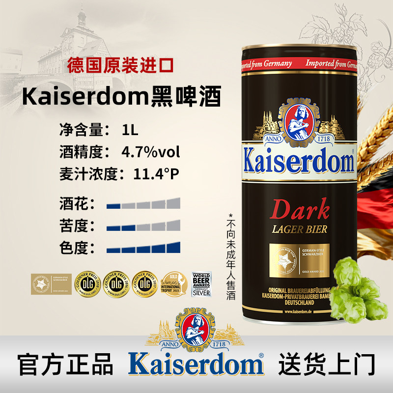 德国进口 Kaiserdom黑啤酒1L 4.7%vol 11.4°P 经典德国黑啤酒
