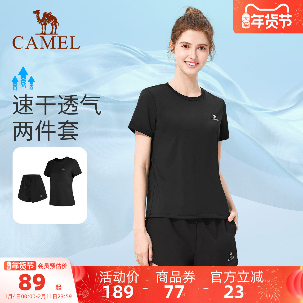 骆驼女装时尚运动套装2025夏季新款速干衣短袖T恤运动短裤两件套