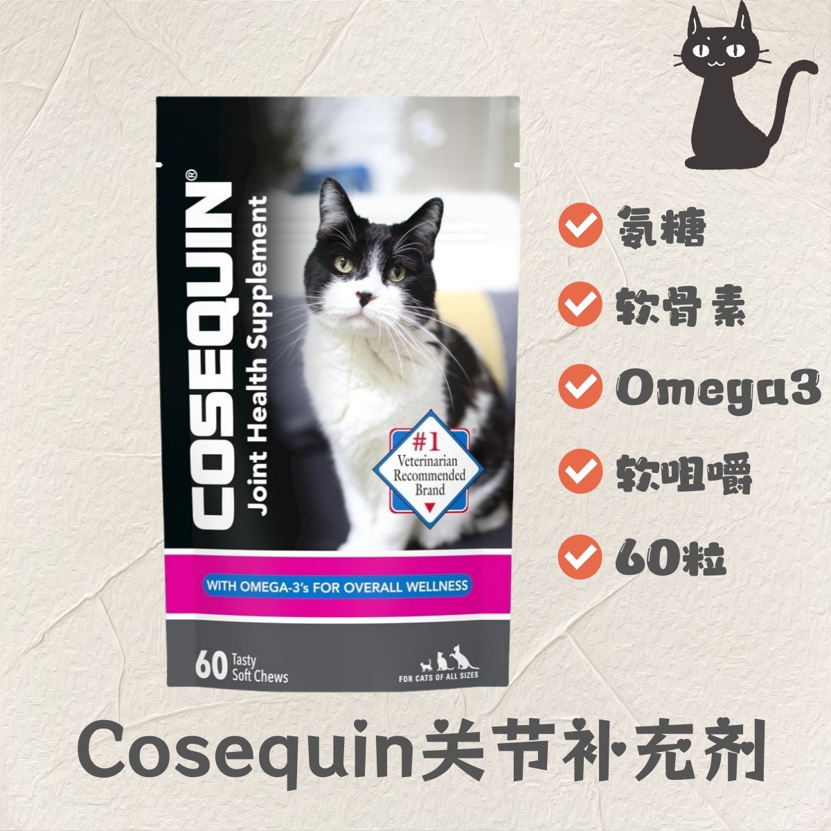 【现货】Cosequin 猫用关节补充剂氨基葡萄糖软骨素Omega3软咀嚼