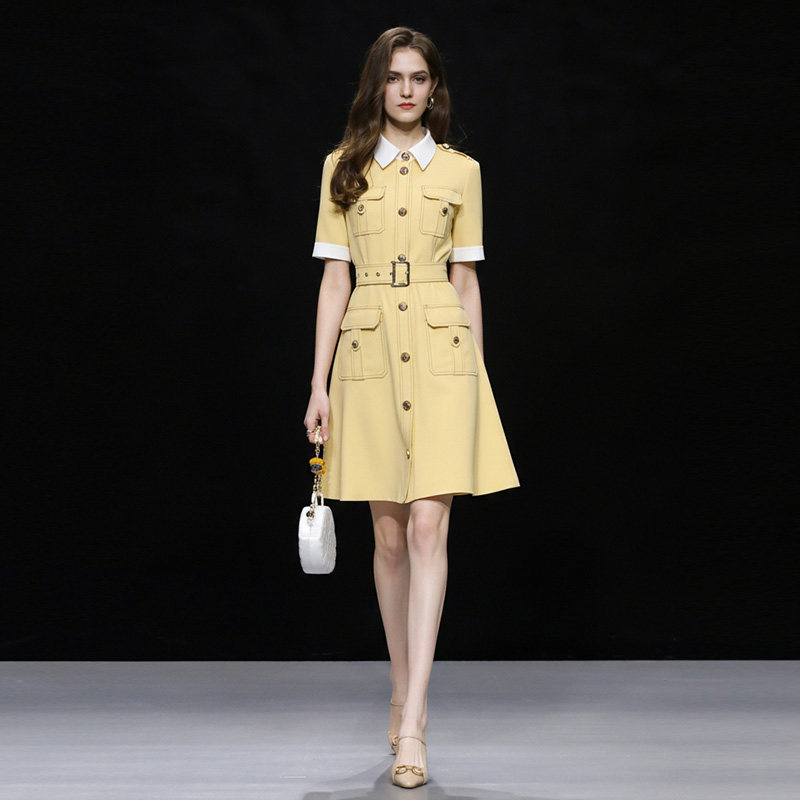 2026年夏季新款时尚贴袋休闲风撞色系带修身短款A字连衣裙女装