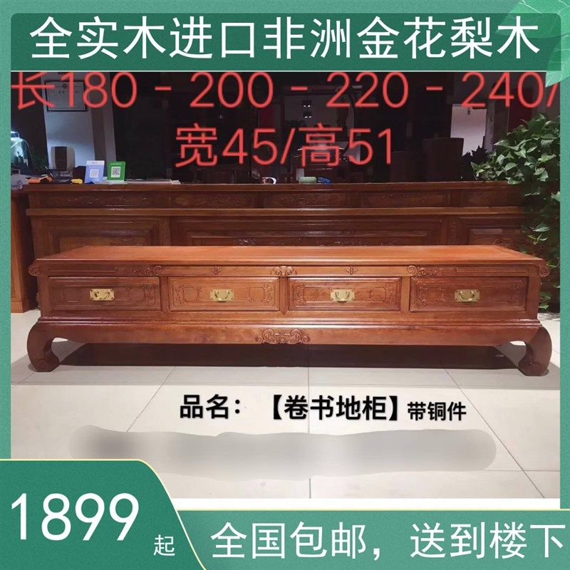 新中式红木家具电视柜家用金花梨四抽卷书菠萝格原木实木储物地柜