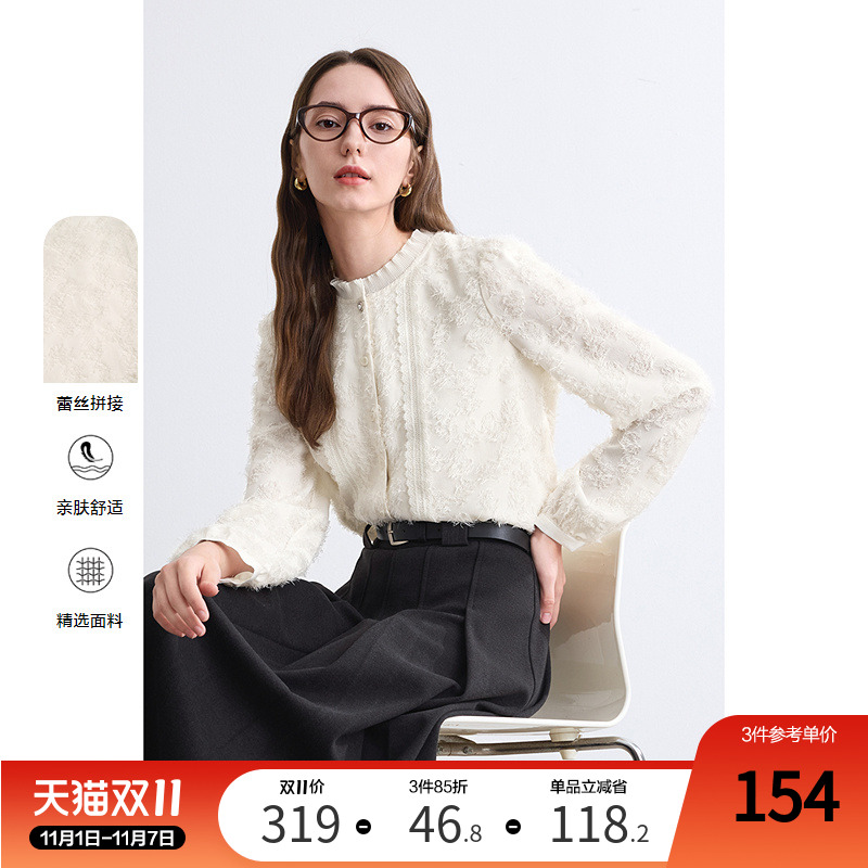 茵曼法式纯棉花边立领衬衫女2025年春季新款通勤内搭气质提花衬衣