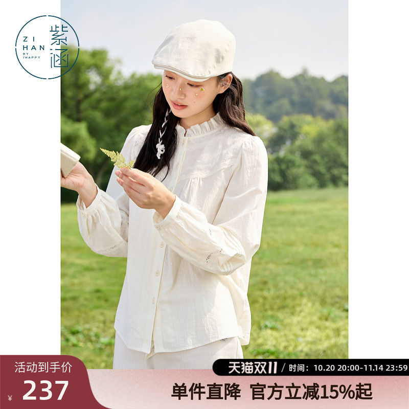 【唐悠悠mgdm】木耳边拼接纯棉宽松衬衫女秋法式立领百搭白色衬衣