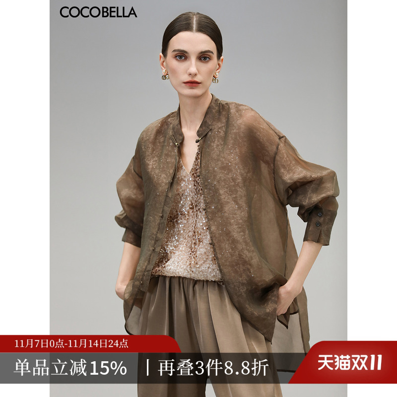 COCOBELLA重工压褶缎面优雅立领衬衫女新中式两穿衬衣SR0045-4