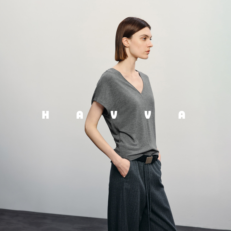 HAVVA气质v领短袖女显瘦半袖小众ins风通勤T恤2025夏季T3-00570