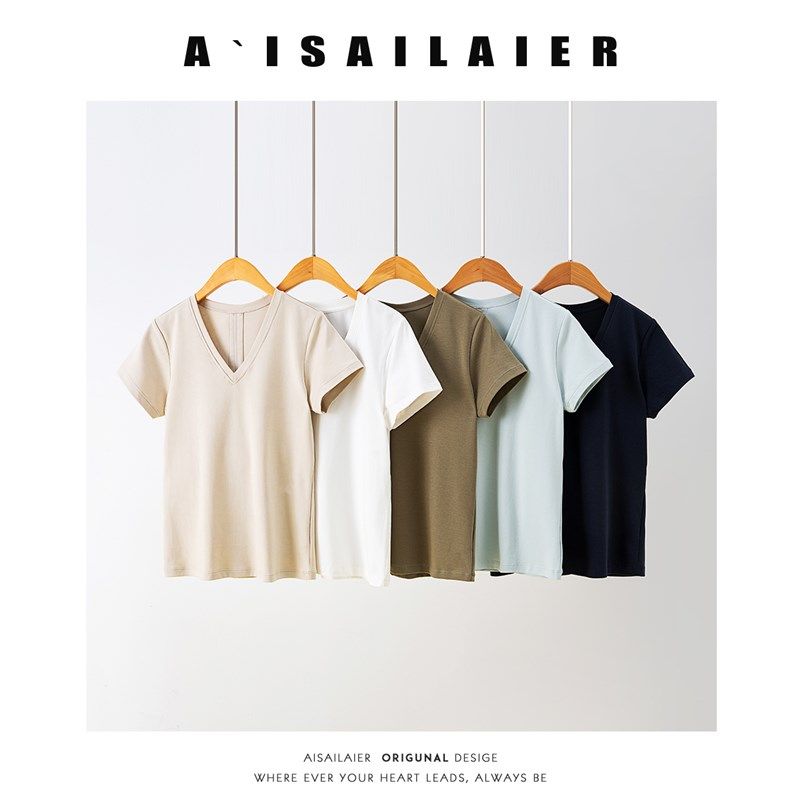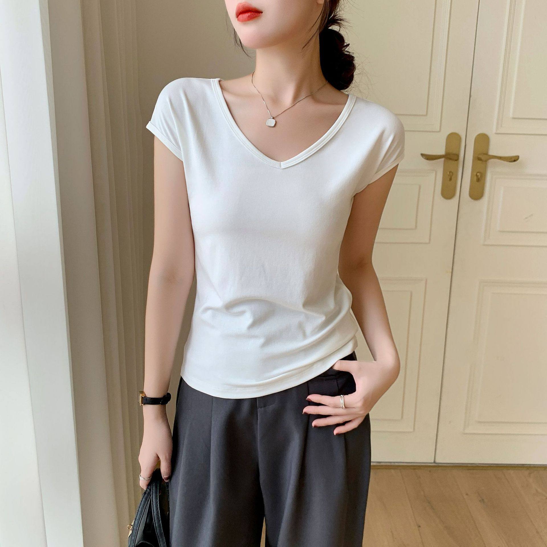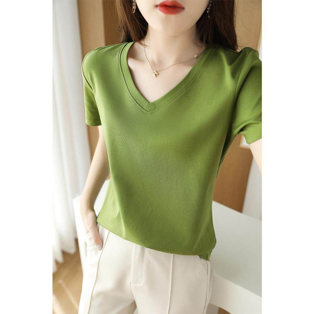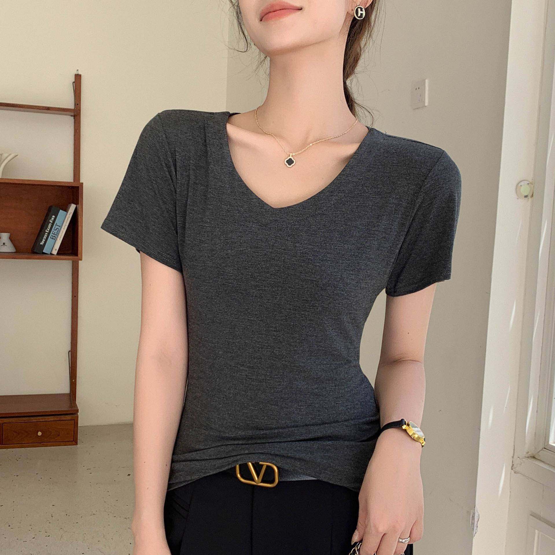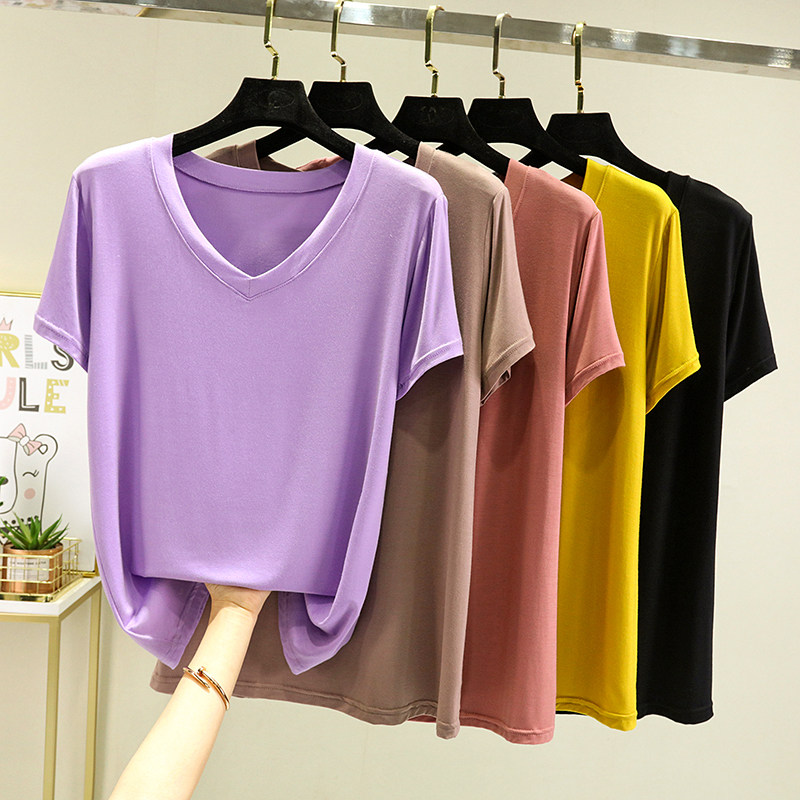 莫代尔v领短袖女夏季纯色半袖T恤内搭显瘦打底衫百搭大码纯色上衣