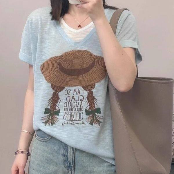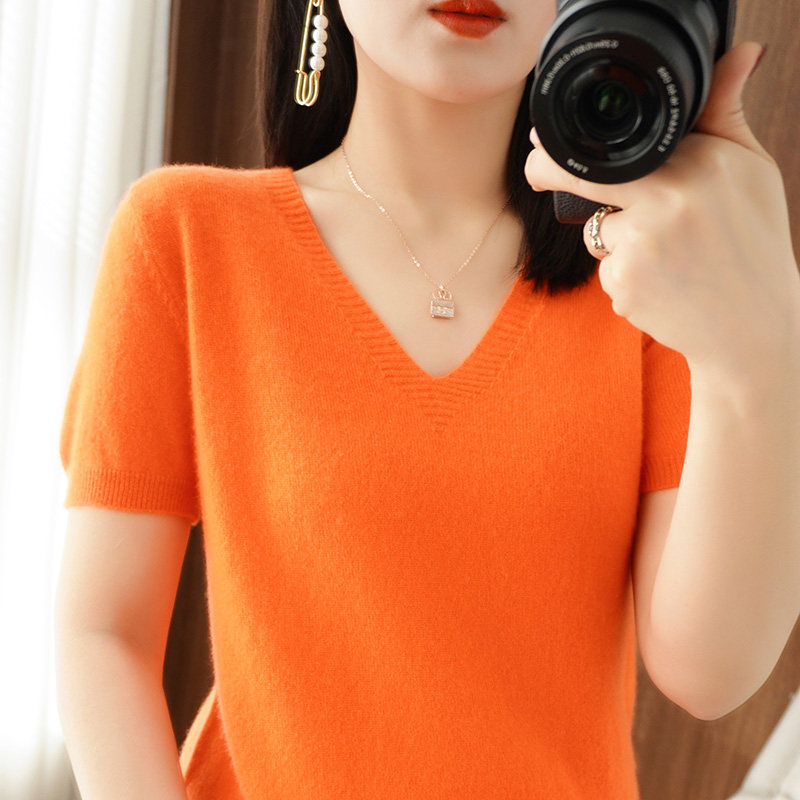 春秋V领短袖女洋气毛衫宽松短款打底衫半袖针织衫薄款夏季T恤上衣