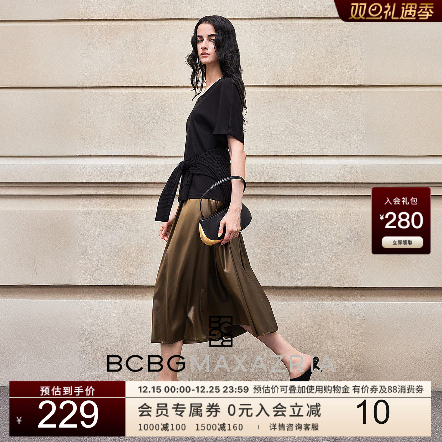 BCBG 2025夏新品 100%棉精致百搭烫钻饰边双层V领短袖女式上衣