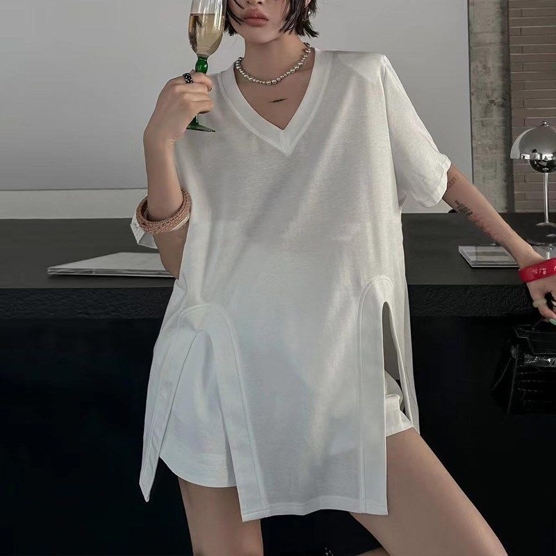 纯欲慵懒风2025新爆款纯棉V领短袖女宽松长t恤遮屁股洋气显瘦上衣