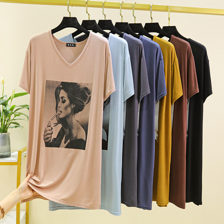 新款莫代尔V领短袖女士夏季长款t恤裙宽松上衣中长款过膝连衣裙