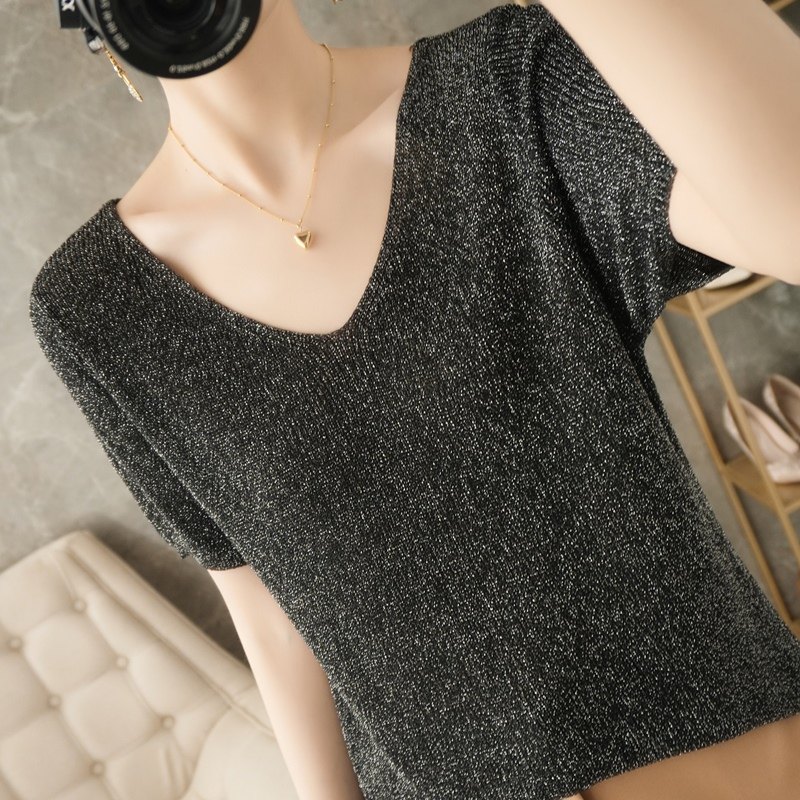 夏季薄款冰丝V领短袖女T恤衫宽松短款亮丝半袖打底衫冰麻针织上衣