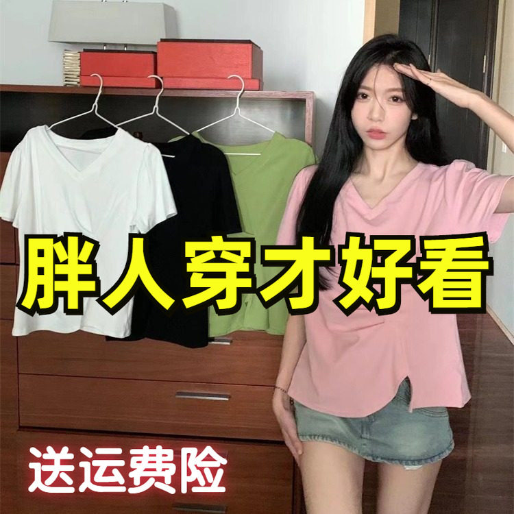 大码200斤弹力莫代尔V领短袖女胖MM加肥夏季新款简约百搭半袖T恤