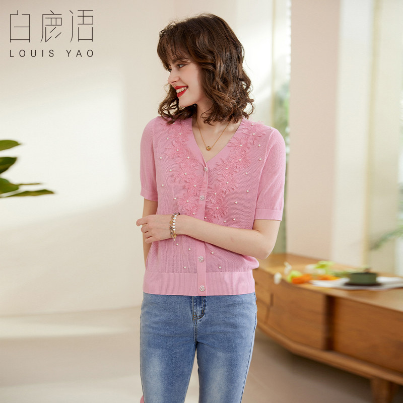 白鹿语甜美风立体花朵开衫25夏款时尚气质钉珠V领短袖女式针织衫