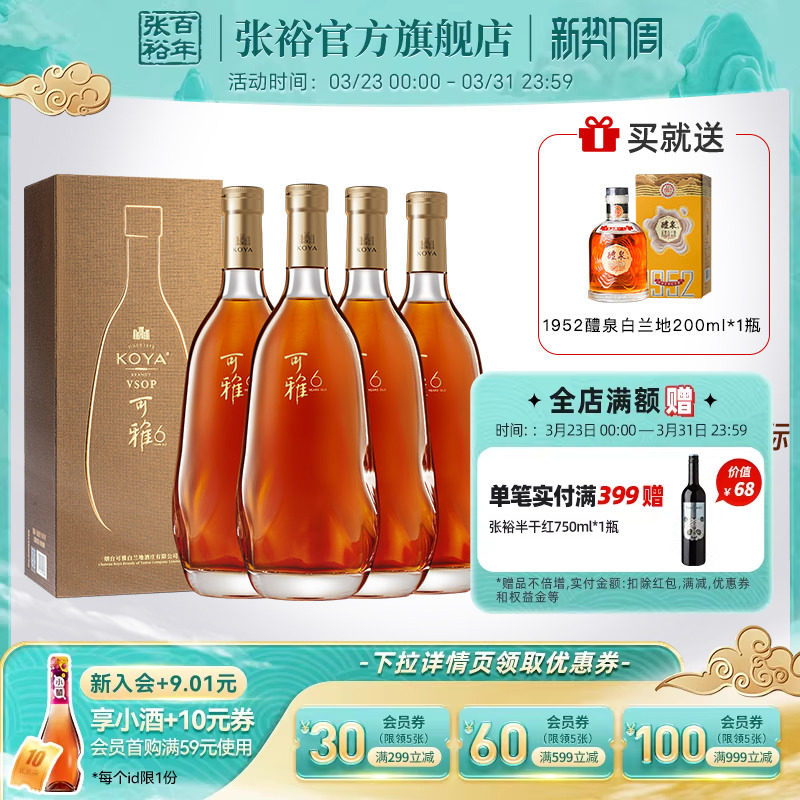张裕官方500ml*4瓶一斤装可雅酒庄白兰地洋酒vsop桶藏6年整箱囤货