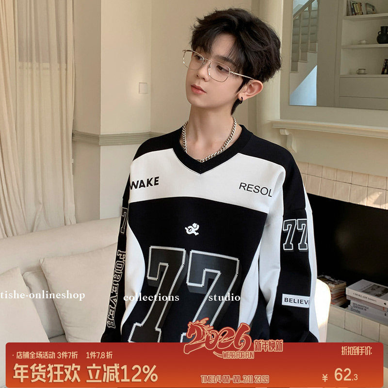 打底衫男大码春秋季卫衣潮流宽松青少年薄款港风套头上衣服运动T