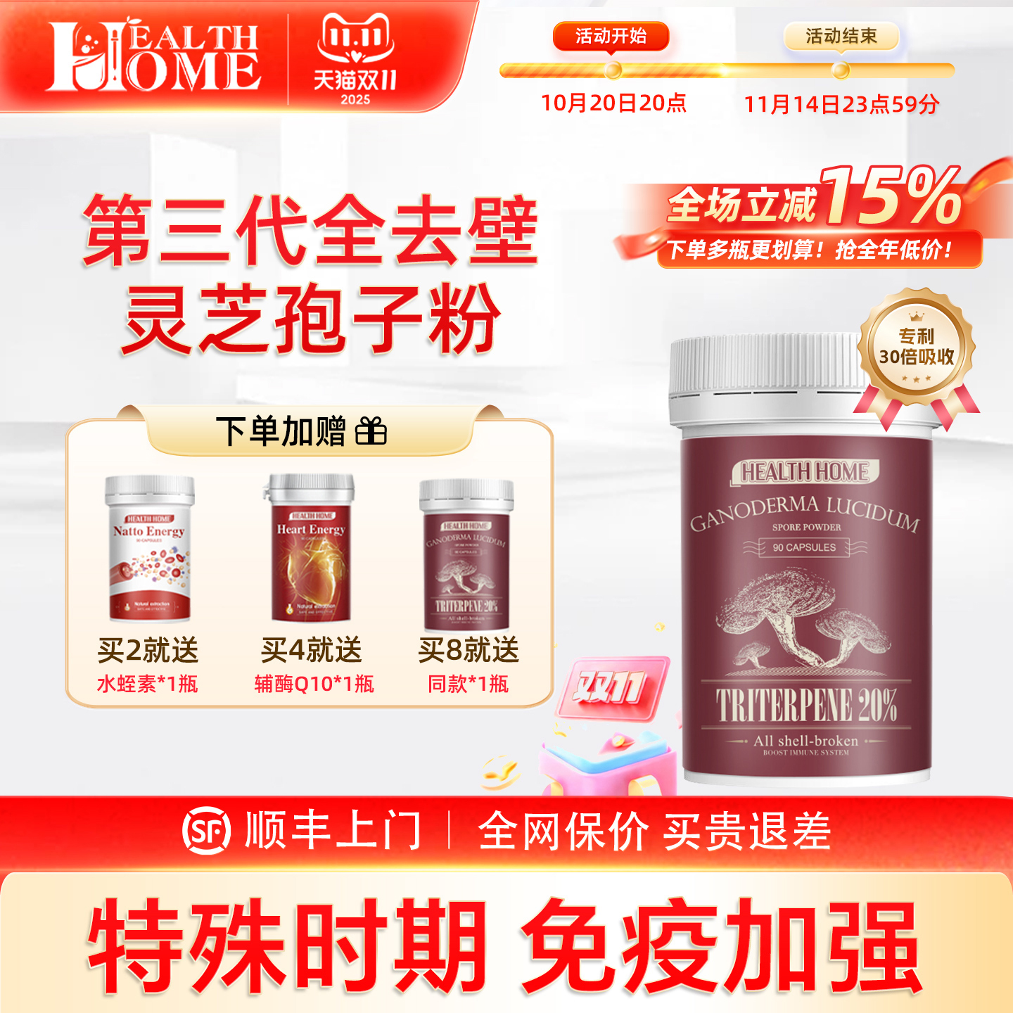 【 灵芝三萜20%】HealthHome去壁灵芝孢子粉胶囊破壁林芝油