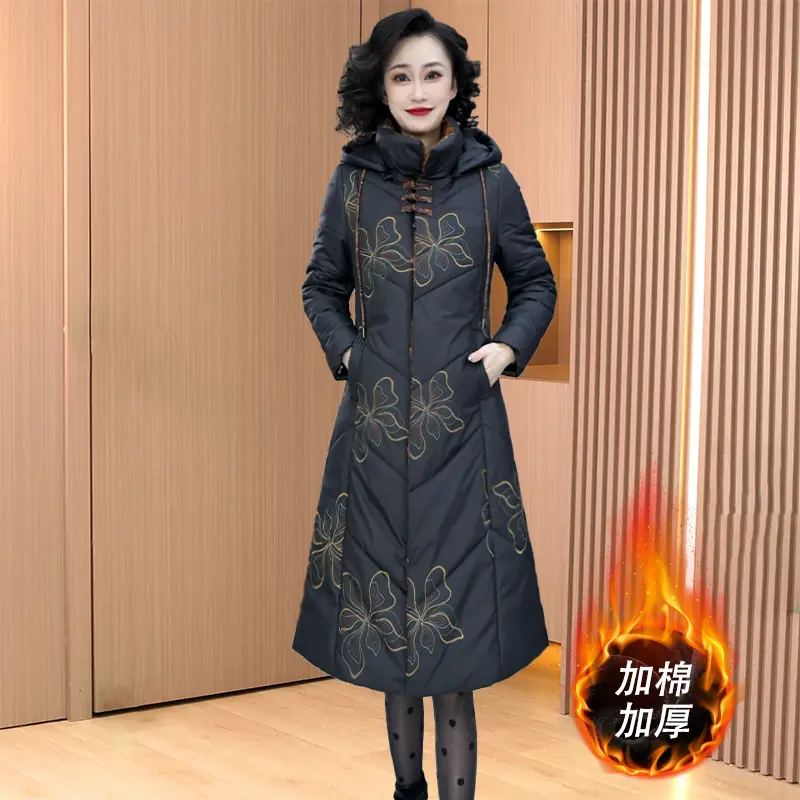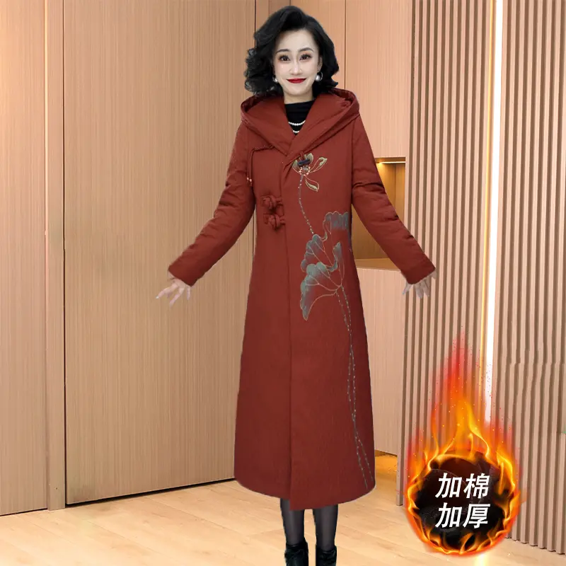 妈妈冬装羽绒棉服中长款修身显瘦中老年女人棉衣新中式国风连帽款